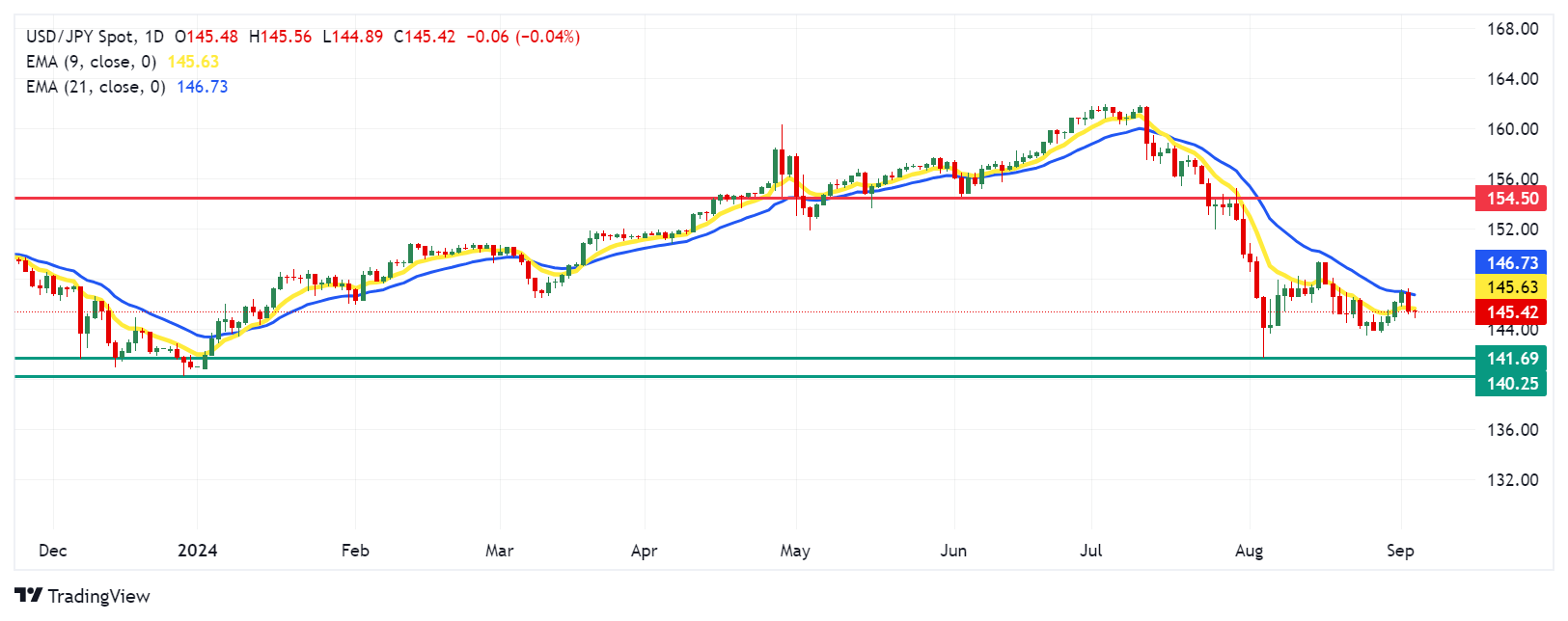 周三,美元/日元的交易价格约为145.40。日线图分析显示,9天指数移动平均线(EMA)低于21天EMA,表明市场呈看跌趋势。此外,14天相对强弱指数(RSI)仍低于50,进一步证实了看跌趋势仍然存在。