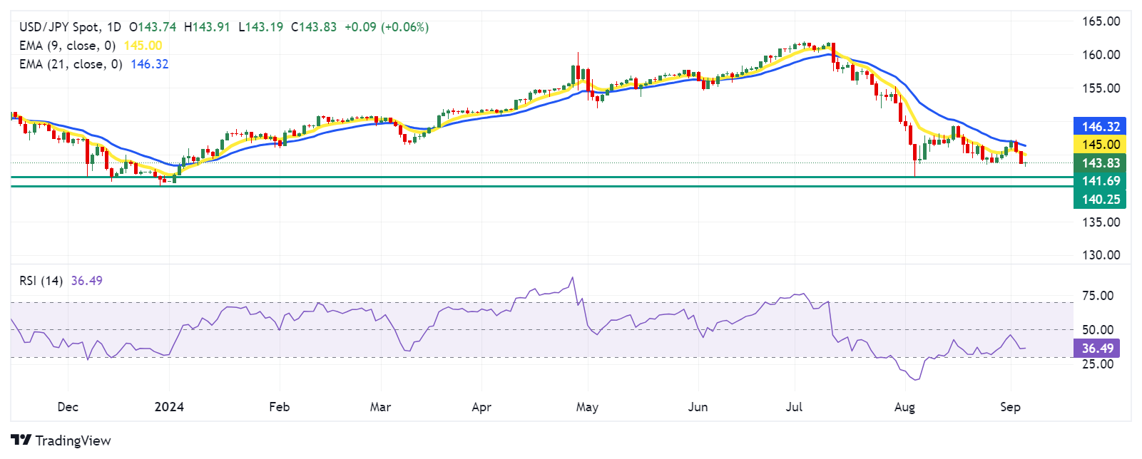 周四,美元/日元的交易价格约为143.80。日线图分析显示,9天指数移动平均线(EMA)仍低于21天EMA,表明市场持续看跌。此外,14天相对强弱指数(RSI)徘徊在30水平附近,证实了持续的看跌势头,但也表明短期内可能会出现向上修正。