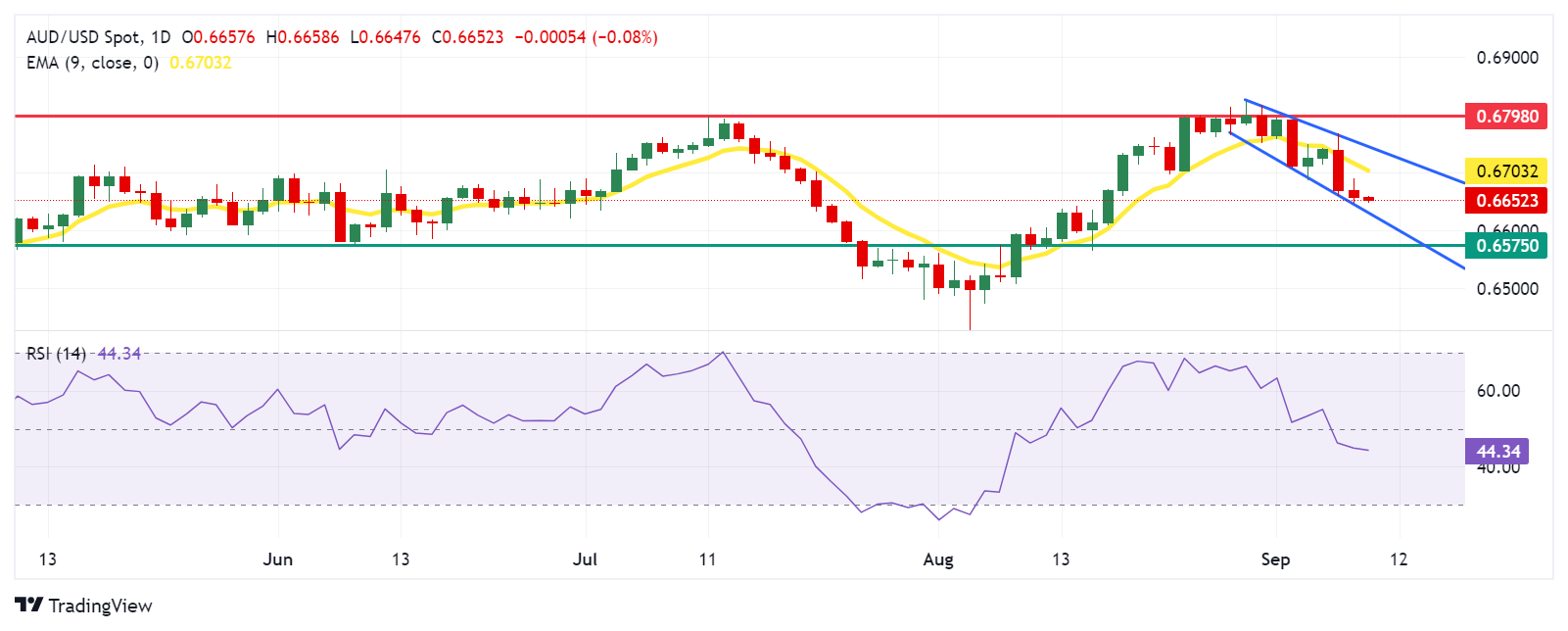 周二,澳元/美元汇率在0.6650左右。日线图分析显示,该货币对正沿着下行通道的下限下行,这表明看跌倾向正在加强。此外,14天相对强弱指数(RSI)跌至50以下,证实了澳元/美元对的持续看跌趋势。
