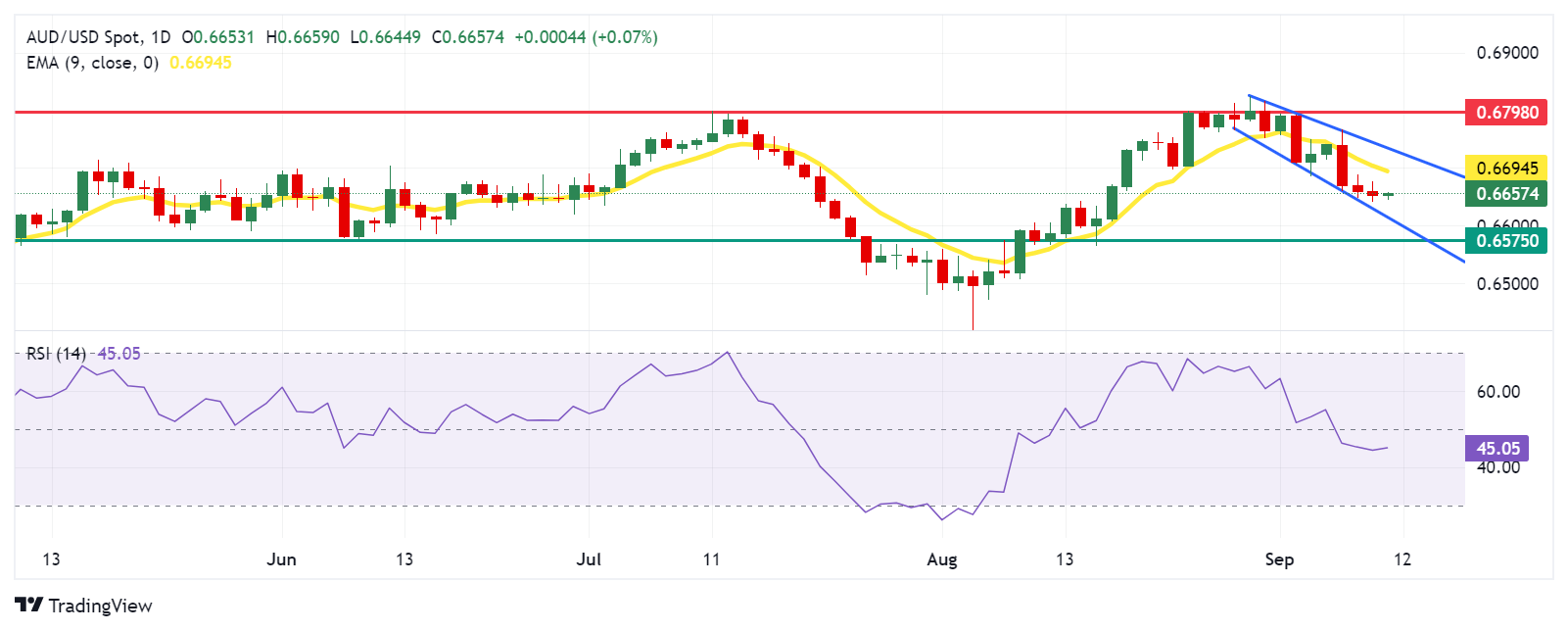 周三,澳元/美元对在0.6650附近交易,对日线图的技术分析表明,该对仍处于下跌通道内,表明存在看跌倾向。14天相对强弱指数(RSI)也低于50,进一步证实了持续的看跌趋势。