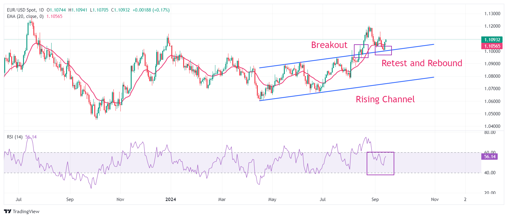 欧元/美元在重新测试了在1.1000心理支撑附近形成的每日上涨通道图模式的突破后飙升。主要货币对的近期前景有所加强,因为它已经攀升至20天指数移动平均线(EMA)之上,该均线的交易价格约为1.1055。