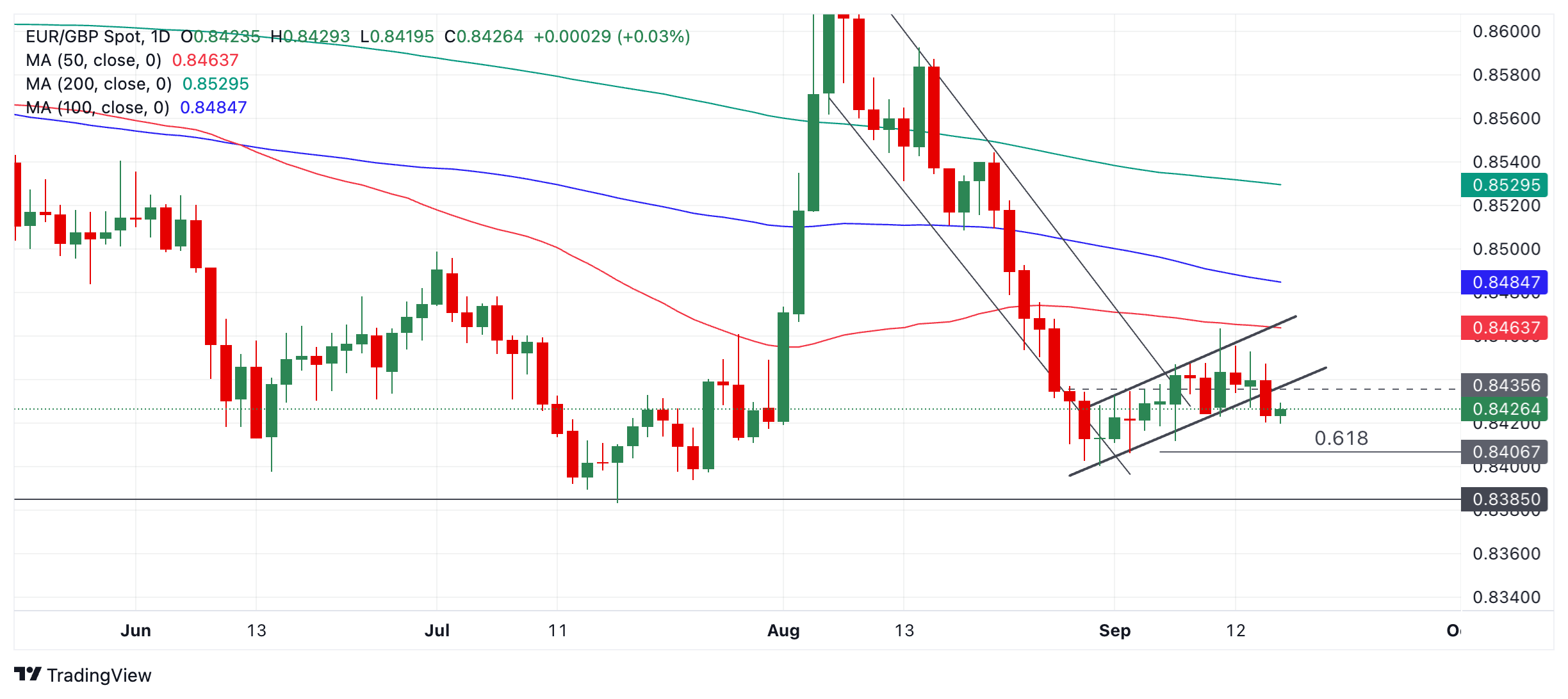 8月份暴跌期间明显的看跌倾向可能正在加剧。跌破0.8419将证实进一步下跌至0.8406的目标,即上升通道高度的0.618 Fib延伸。低于此水平,价格可能会跌至0.8385的支撑位。
