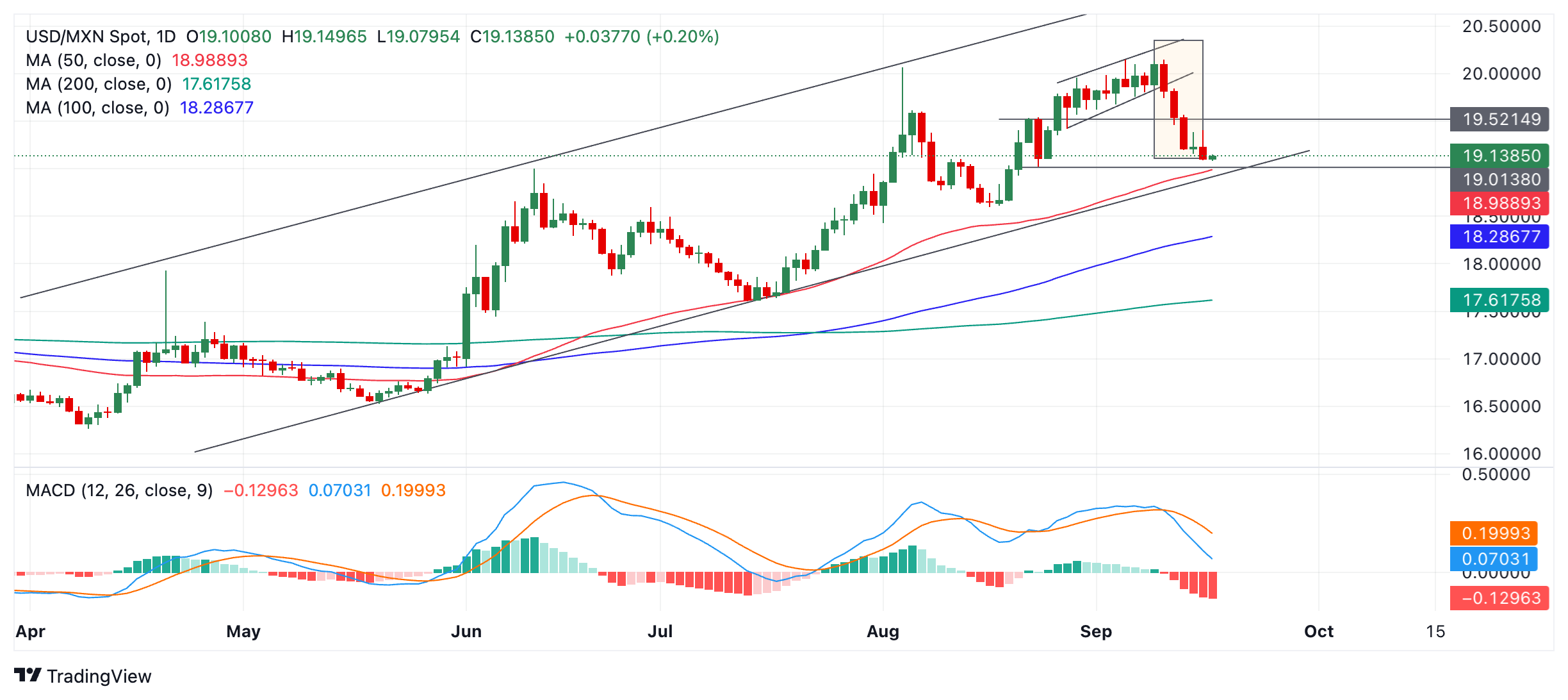 美元/墨西哥比索从较低的通道线和50天SMA跌至主要支撑位附近。