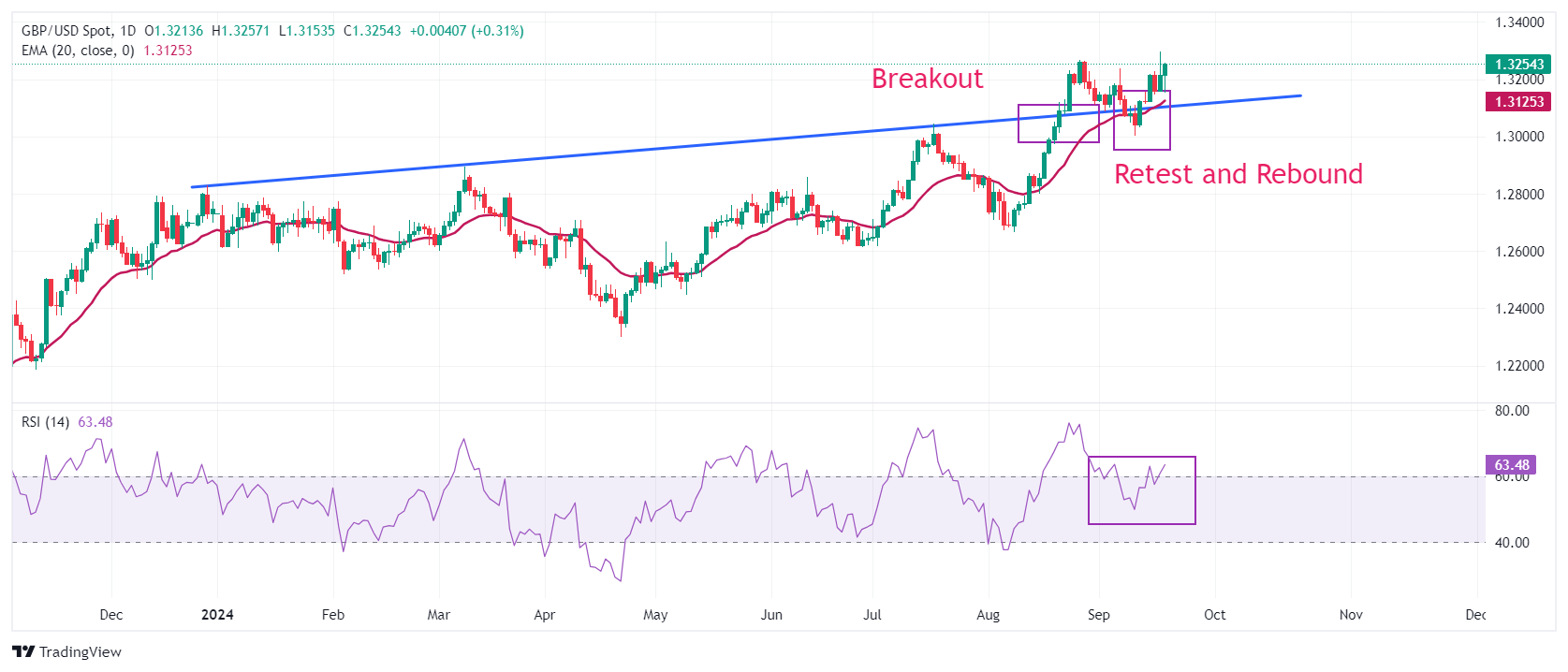 英镑兑美元在欧洲交易时间接近1.3300。英镑/美元对的近期前景仍然坚挺,因为它保持在1.3100附近的20天指数移动平均线(EMA)上方。早些时候,Cable在从2023年12月28日高点1.2828的趋势线附近恢复后走强,在8月21日突破后大幅上涨。