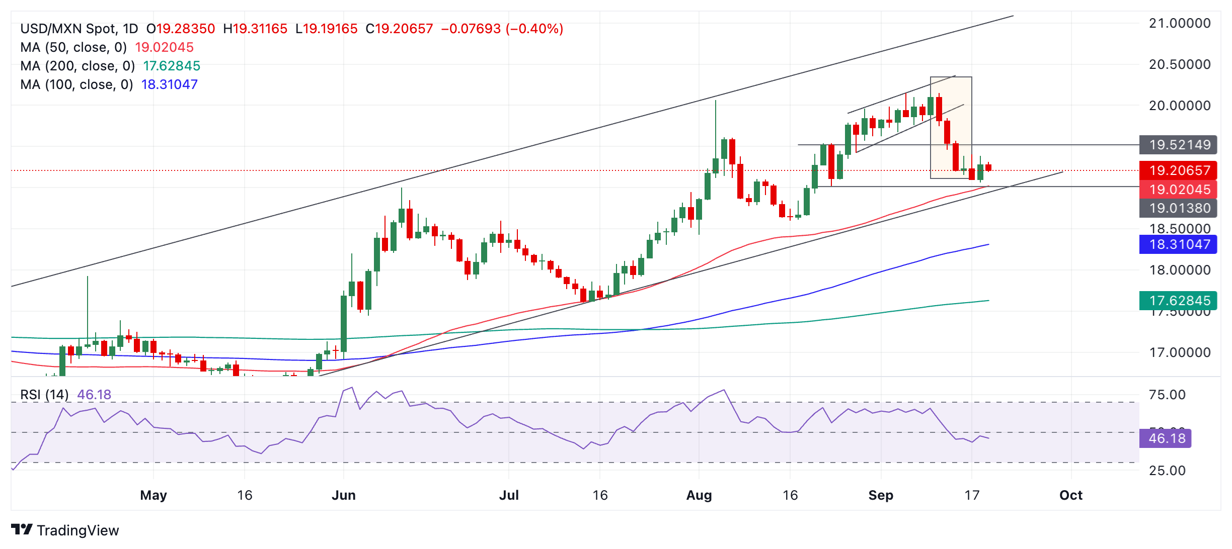 美元/墨西哥比索正在上涨通道和50天SMA的基础上进行盘整。