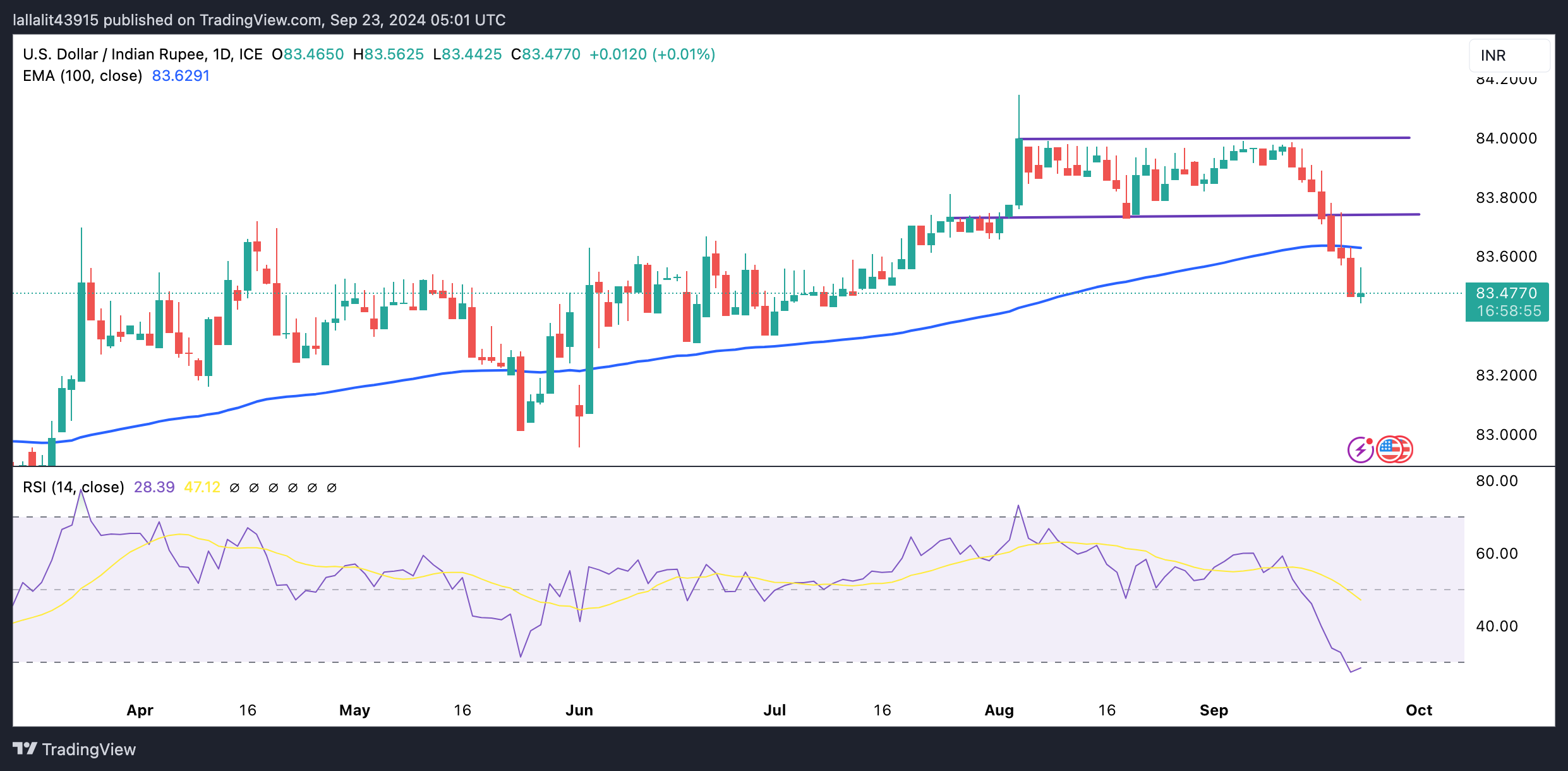 83.62的100日均线是美元/印度卢比的第一个上行障碍。84.00的心理水平似乎是美元/印度卢比多头难以突破的难题。
