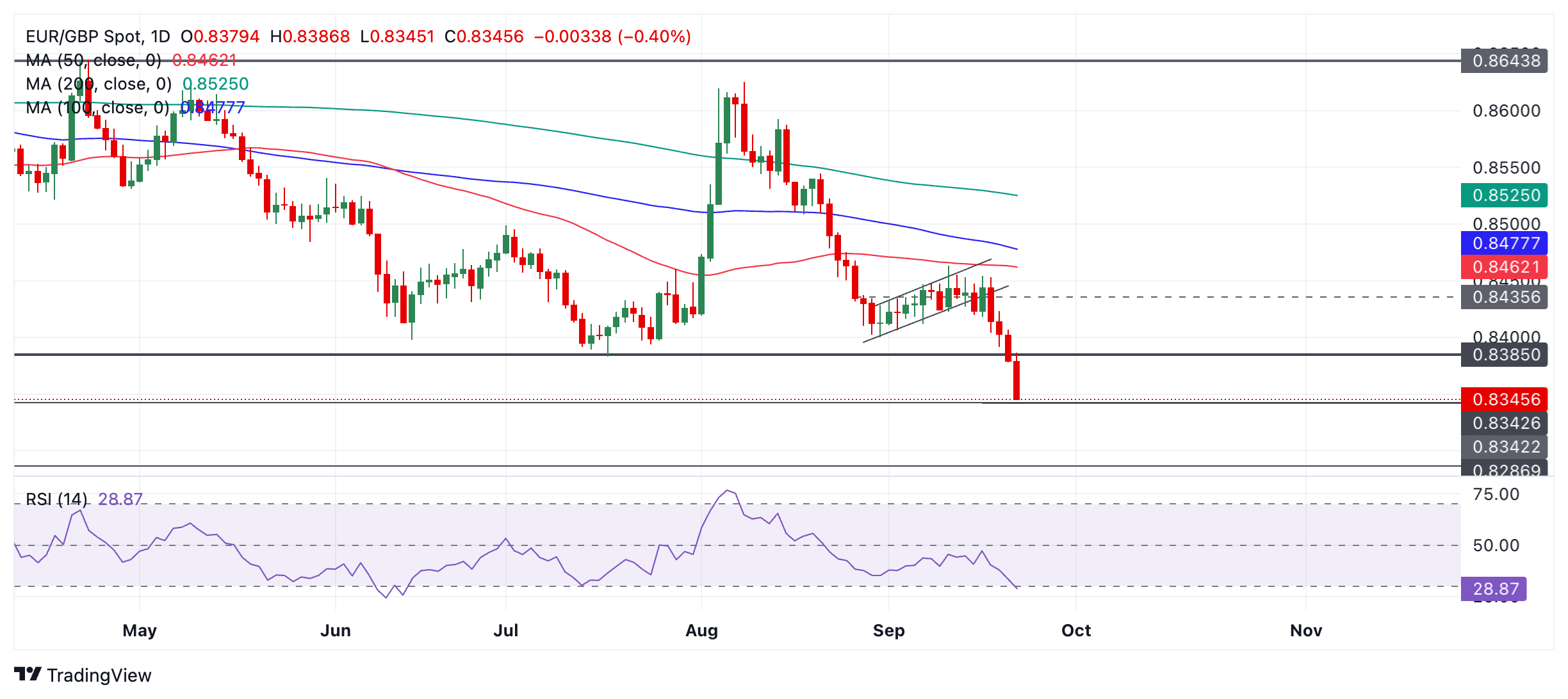 欧元/英镑已果断跌破2024年7月18日的低点,达到0.8343的下一个关键目标水平。