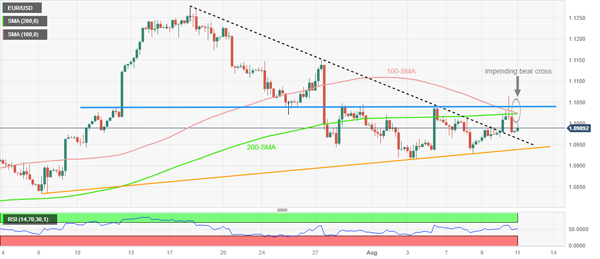 另一方面,100 移动平均线从上方刺穿 200 移动平均线并形成熊市交叉,同时在1.1025 移动平均线汇合点下方挑战欧元买家。