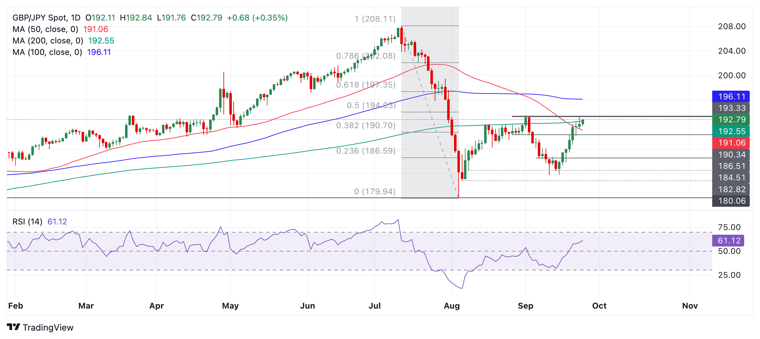 预计周三英镑/日元将连续第八天上涨。它已经测试,然后从9月2日的关键高点193.49回落,这是一个主要的阻力位。尽管存在障碍,但短期趋势是看涨的,并可能持续下去,等待决定性的突破。