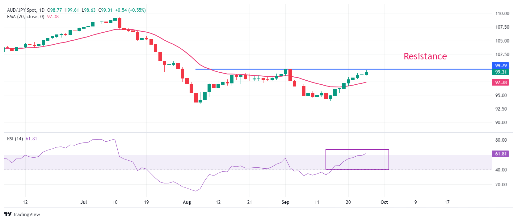 澳元/日元走强,突破9月2日高点99.87的水平阻力位。如果连续九天获胜,风险晴雨表将突破即时阻力。在97.40附近向上倾斜的20天指数移动平均线(EMA)表明近期趋势看涨。