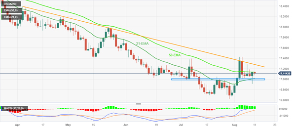 也就是说,看涨的 MACD 信号加上美元/墨西哥比索货币对有能力保持在 21 天指数移动平均线 (EMA) 和五周水平支撑之上,从而使买家有希望访问 17.00 至 16.98 之间的区域。
