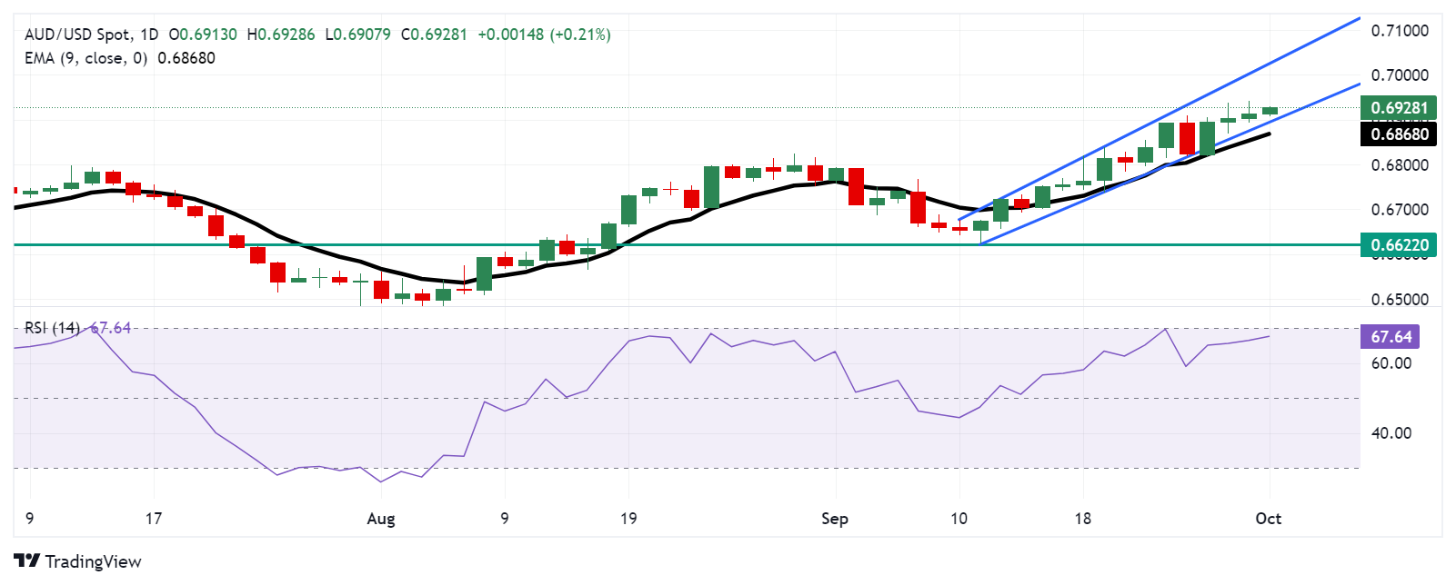 技术分析:澳元保持在上升通道的下限0.6900上方