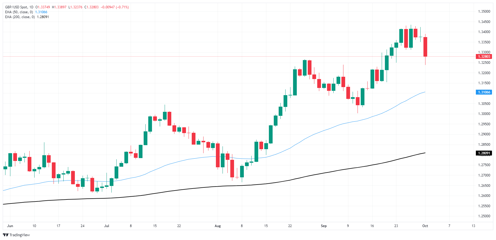 英镑周二的下跌已将货币对拉回到1.3300关口下方。价格走势目前准备下行延伸至 1.3100 附近的 50 日指数移动平均线 (EMA)。然而,要进一步看跌至 1.3000 上方的先前摆动低点,方法绝非简单。