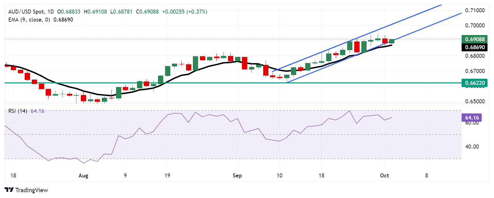 周三,澳元/美元在0.6910附近交易。日线图技术分析显示,该货币对正试图重新融入上升通道。这表明看涨倾向正在发挥作用。14天相对强弱指数(RSI)也保持在50以上,支持持续的看涨情绪。
