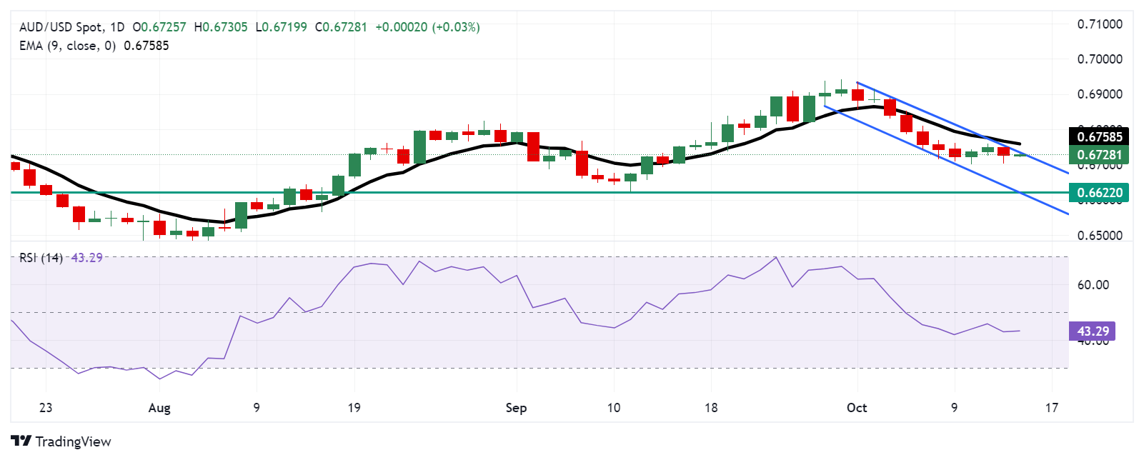 周二,澳元/美元汇率徘徊在0.6730左右。日线图的技术分析显示,该货币对正在测试下行通道模式的上限。成功突破这一水平可能意味着动量从看跌转向看涨。然而,14天相对强弱指数(RSI)仍低于50,表明看跌势头依然存在。