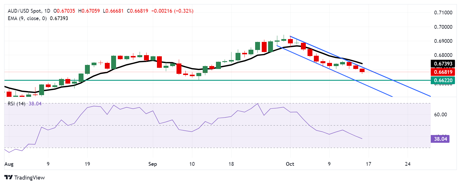 周三,澳元/美元汇率徘徊在0.6680左右。日线图的技术分析表明,该货币对正沿着下降通道的上限向下移动,这表明存在看跌倾向。14天相对强弱指数(RSI)也保持在50以下,加强了持续的看跌势头。
