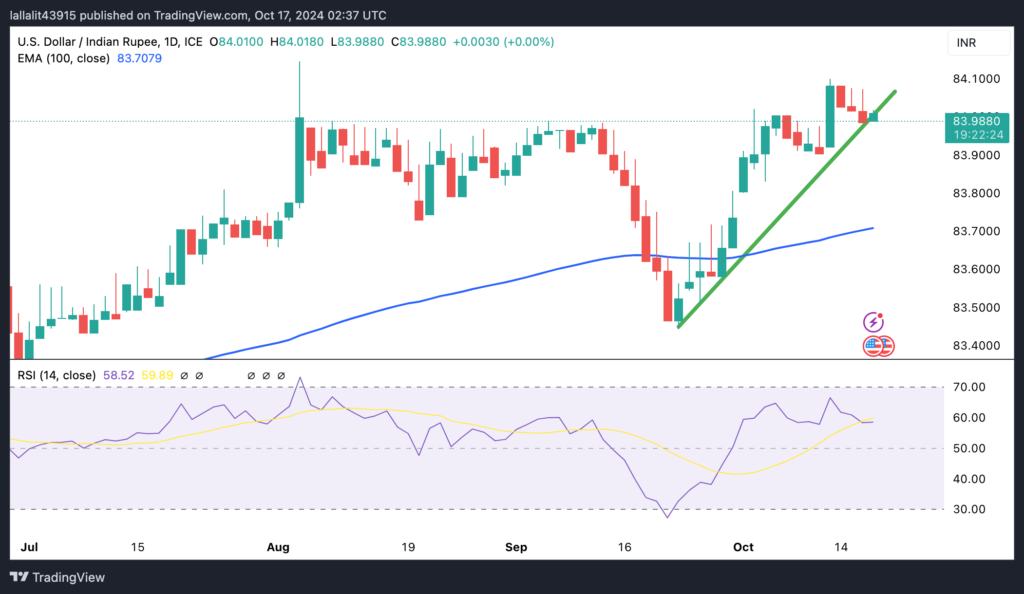 印度卢比当天交易处于负值区域。从技术上讲,美元/印度卢比对保持看涨氛围,因为价格保持在日线图上的上升趋势线和关键的100天指数移动平均线(EMA)之上。上升势头得到了14天相对强弱指数(RSI)的支持,该指数位于58.80附近的中线之上,暗示上升趋势更有可能获得牵引力而不是逆转。
