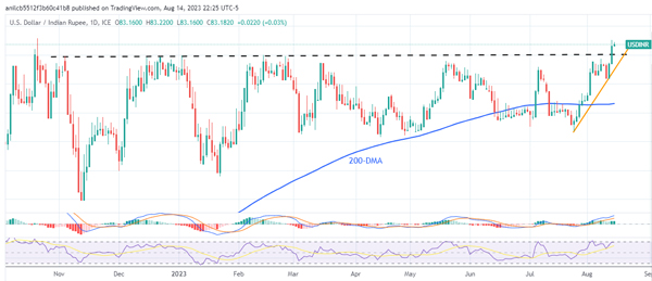 最重要的是,印度卢比空头仍然充满希望,除非报价提供日收盘价低于 200 日均线 82.15 的水平。