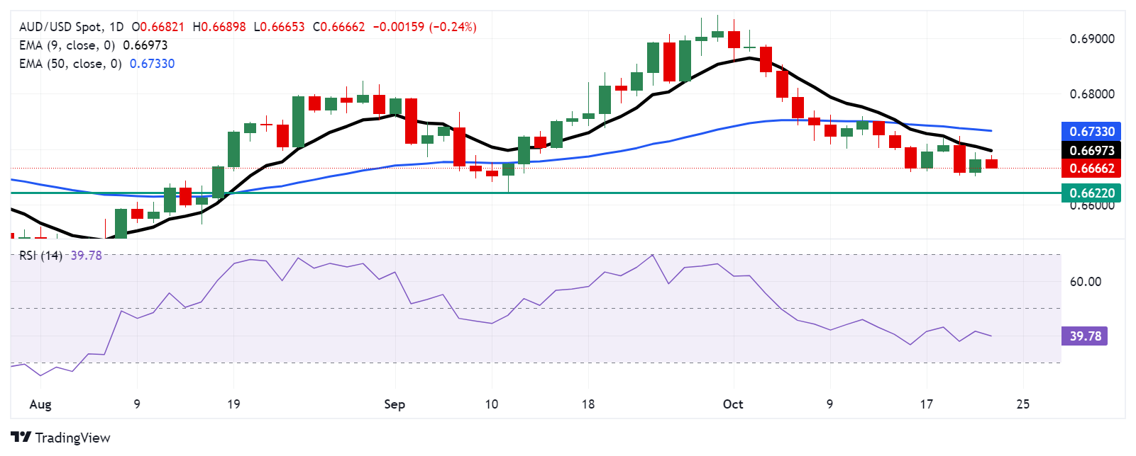 周三,澳元/美元对在0.6670左右交易,日线图的技术分析表明,由于该对仍低于九天指数移动平均线(EMA),因此短期看跌前景。此外,14天相对强弱指数(RSI)低于50,进一步支撑了看跌情绪。