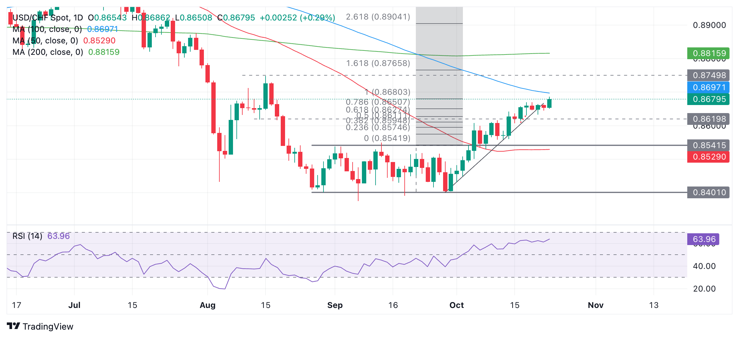 美元/瑞士法郎从9月下旬的低点延续上涨趋势,并接近100天简单移动平均线(SMA)的阻力位,目前位于0.8697。