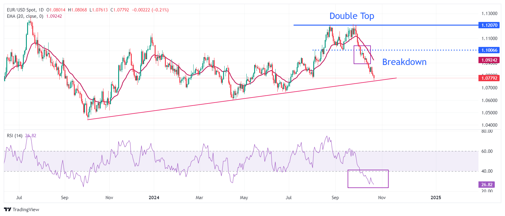 欧元/美元在北美交易时间跌至1.0760附近。主要货币对的前景仍然悲观,因为它仍低于200天指数移动平均线(EMA),EMA的交易价格约为1.0900。