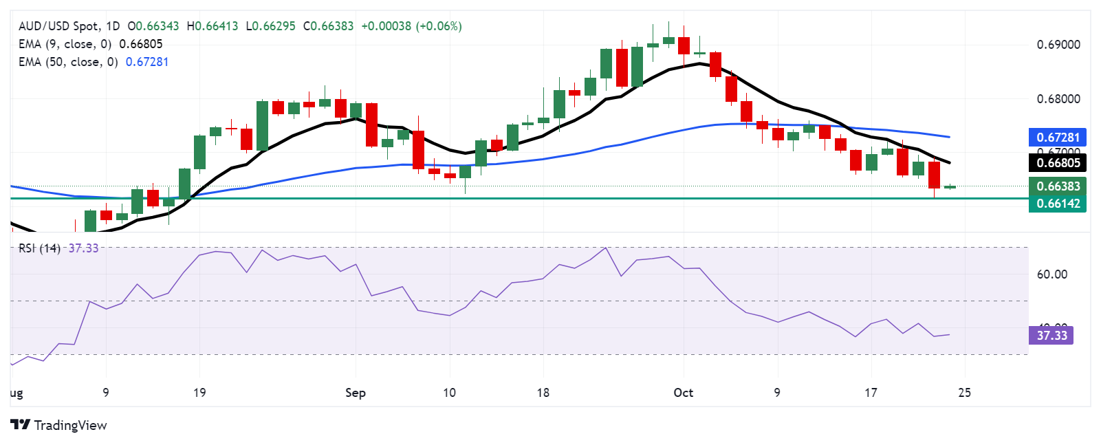 周四,澳元/美元汇率在0.6640左右。日线图的技术分析表明,短期看跌前景,因为该货币对仍低于九天指数移动平均线(EMA)。此外,14天相对强弱指数(RSI)低于50,强化了看跌情绪。