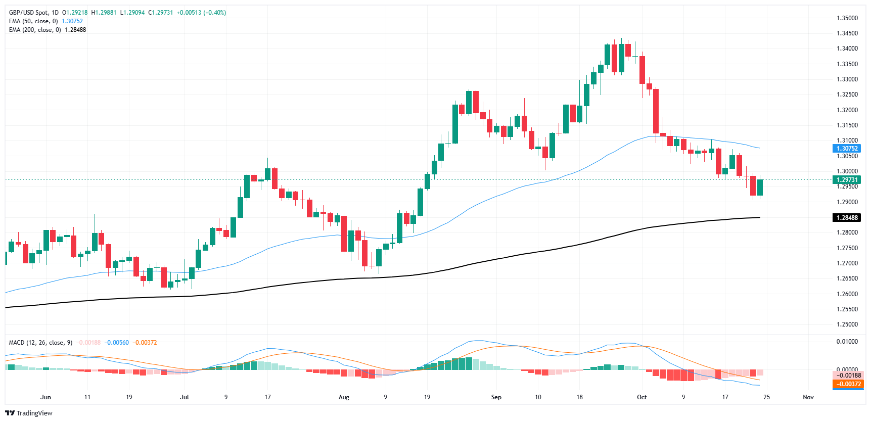 MACD指标目前处于看跌区域,MACD线(蓝色)位于信号线(橙色)下方,直方图显示负动量。这表明看跌压力仍然普遍存在。然而,最近MACD直方图的收窄表明,抛售势头可能正在减弱,如果该货币对保持在1.2848支撑位之上,潜在的看涨交叉可能会实现。每日收盘价低于这一支撑位可能会加速向1.2700区域的下行,而反弹至1.3050阻力位上方可能会重振多头,瞄准1.3200区域。