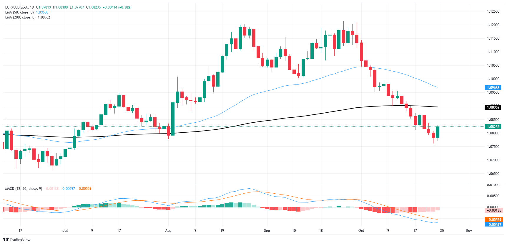 周四,欧元/美元半心半意地复苏,反弹了0.1%,并回升至1.0800点以北。尽管本周晚些时候出现反弹,但光纤在从9月底1.1200附近的峰值出价下跌超过4%后,仍大幅偏离近期高点。