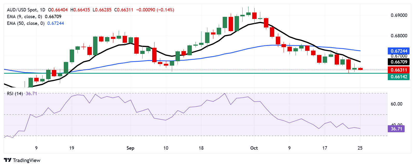 周四,澳元/美元对在0.6640左右交易,日线图的技术分析表明短期看跌趋势。该货币对仍低于9天指数移动平均线(EMA),14天相对强弱指数(RSI)低于50,进一步证实了看跌倾向。