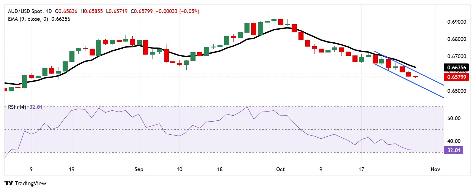 周二,澳元/美元在0.6570附近交易。日线图分析表明,随着该货币对在下降通道内继续走低,存在短期看跌倾向。14天相对强弱指数(RSI)接近30,强化了看跌倾向。