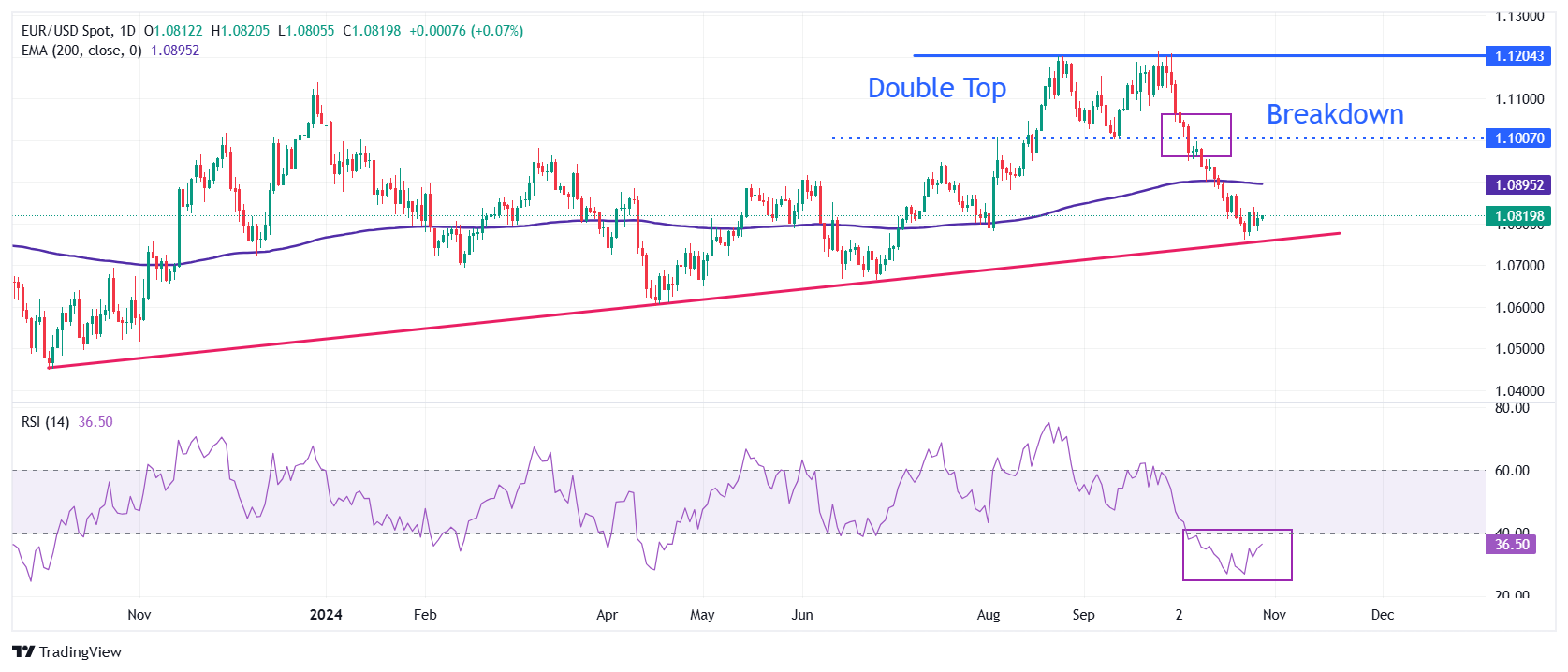 欧元/美元继续保持在1.0750附近的向上倾斜趋势线之上,该趋势线是从2023年10月3日开始绘制的,在每日时间范围内处于1.0450左右的低点。然而,主要货币对的整体前景仍然看跌,因为它仍低于200天指数移动平均线(EMA),EMA的交易价格约为1.0900。
