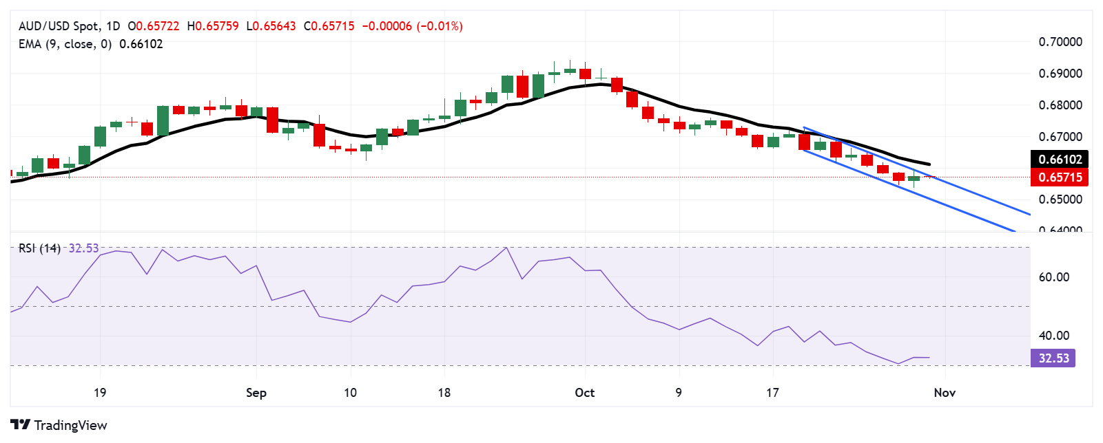 周四,澳元/美元在0.6570附近徘徊。日线图显示了短期看跌趋势,因为该货币对在下跌通道内交易。14天相对强弱指数(RSI)呈下降趋势,略高于30点,强化了看跌情绪。