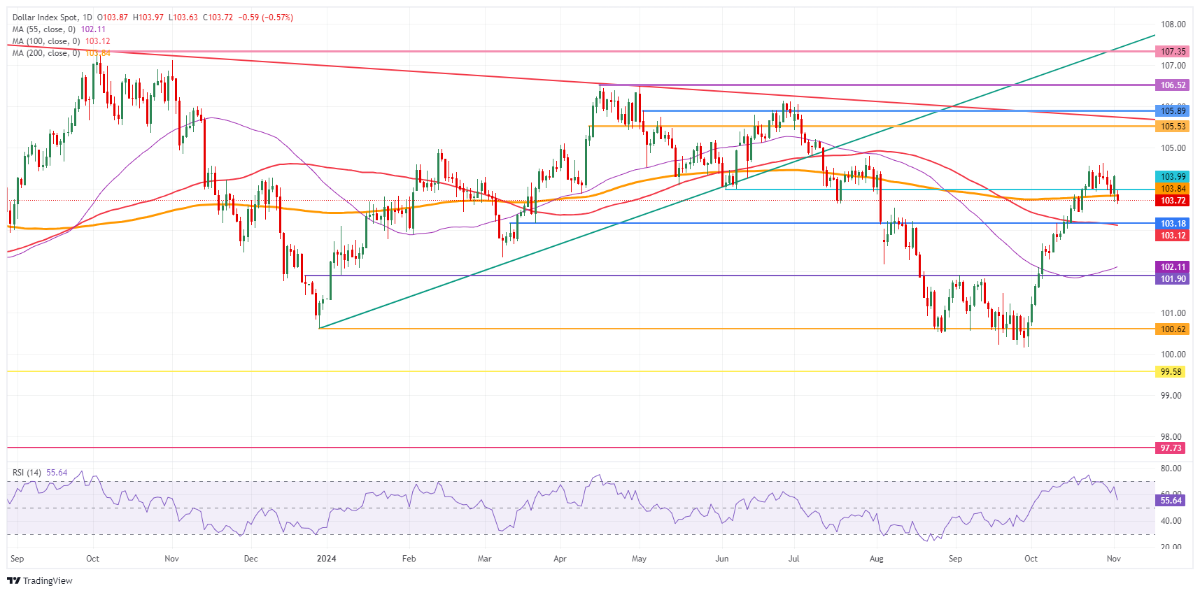 美元指数(DXY)本周将进入一段剧烈波动期,因此在交易美元时需要采取预防措施。预计将出现大规模的波动,主要是头条新闻,甚至可能是不明确的方向和选举后几天的快速行动。更大的水平——比如下行102.11和上行105.53——需要被视为可能的结果。