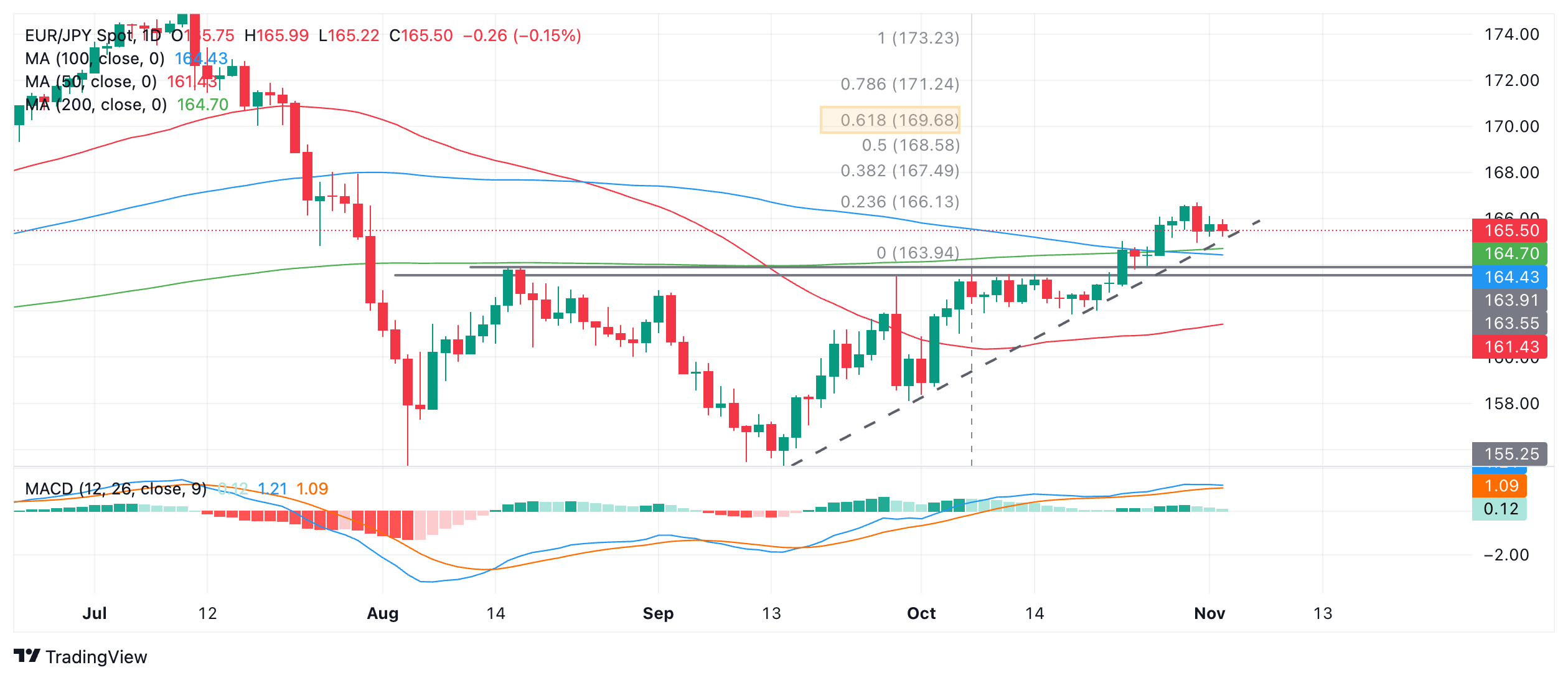 欧元/日元在短期和中期上涨趋势中回落。自9月低点以来,该货币对已跌至反弹趋势线(虚线)的水平。鉴于趋势是看涨的,技术分析理论说“趋势是你的朋友”,一旦修正完成,上涨的可能性就会更大。