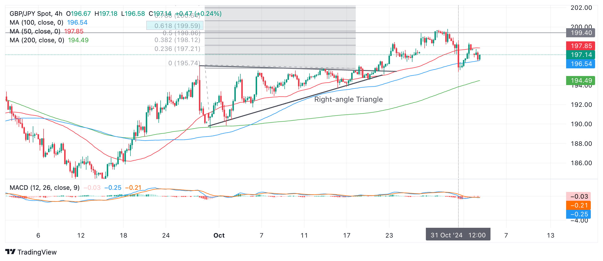 英镑/日元在突破10月份形成的直角三角形后上涨,并达到价格模式的最低价格预期,即199.59,这是三角形最宽点高度的61.8%斐波那契延伸,更高(蓝色阴影矩形)。