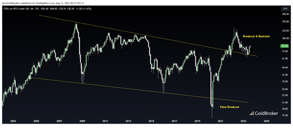 石油图表可能是最明显的迹象,因为它已经形成了一个巨大但经典的 20 年看涨下降楔形。请注意 2020 年的巨大假突破如何为价格脱离楔形提供了跳板,此后该楔形已成功进行回测,现在看起来有望继续上涨至更高的价格。