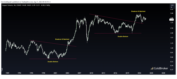铜的图表有点微妙,但很有趣。请注意,当前长达十年的看涨楔形(带有双底)几乎是 1994 年至 2004 年期间形成的楔形的复制分形。虽然这次的突破和回测更加明显,但其设置与 2004 年类似,当时回测后的冲动走高导致价格在短短 3 年内上涨 4 倍。设置肯定会看到 10 美元+ 这十年的铜!