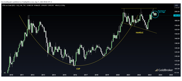 检查一下 黄金,毫无疑问,价格已从 5 月份的 2,080 美元左右跌至撰写本文时的 1915 美元左右,这无疑令人有些沮丧。然而,该图表向我们表明,其 12 年的 Cup & Handle 不仅完好无损,而且过去三个月的交易行为可能代表着对 2011 年高点的非常健康的回测。如果价格能够保持在 1900 美元区域上方,并且理想情况下本月收于 1915 美元上方,那么这次成功的回测可能会成为一个发射台,让金价跟随石油和铜价走高。