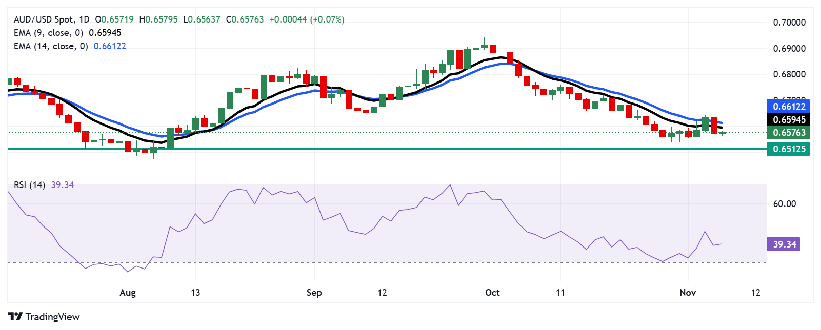 周四,澳元/美元汇率在0.6570左右。日线图技术指标表明,看跌趋势可能会持续下去。该货币对位于9天和14天指数移动平均线(EMA)下方,表明下跌势头。14天相对强弱指数(RSI)也保持在50以下,强化了看跌前景。