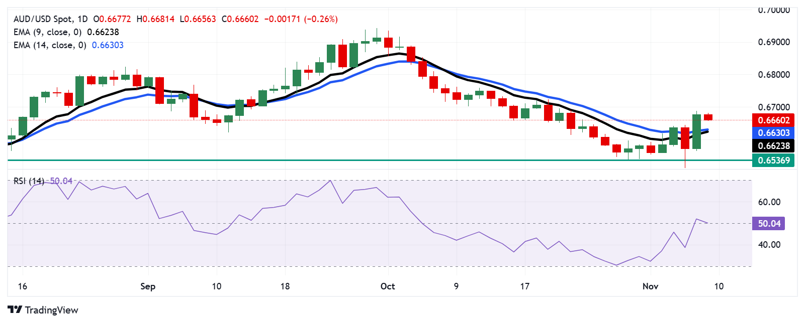 周五,澳元/美元对在0.6660附近交易,显示日线图上从看跌转向看涨。该货币对已经超过了9天和14天的指数移动平均线(EMA),表明了短期的上升势头。此外,14天相对强弱指数(RSI)已突破50大关,表明持续的看涨情绪。