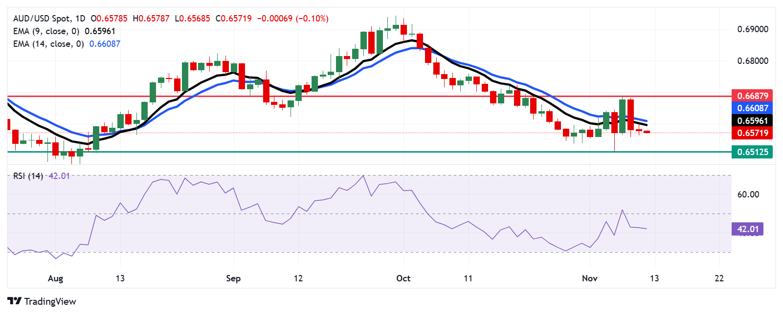 周二,澳元/美元的交易价格约为0.6570。日线图分析显示短期下行压力,因为该货币对仍低于九天指数移动平均线(EMA)。此外,14天相对强弱指数(RSI)在50点以下盘整,强化了看跌前景。