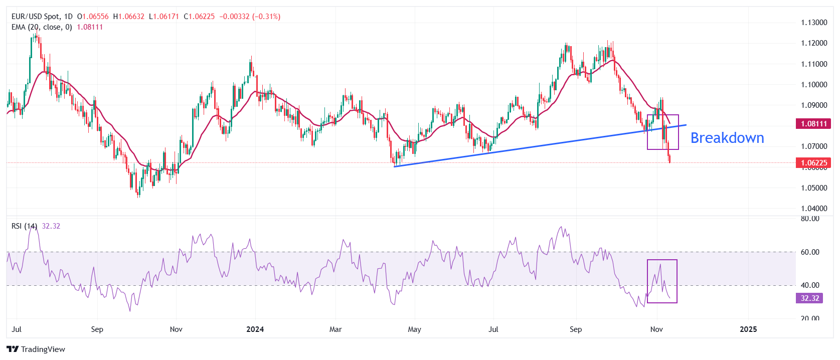 欧元/美元在周二的欧洲交易日跌至近七个月低点1.0620以下。由于当选总统唐纳德·特朗普在竞选期间誓言将进口关税提高10%,对欧元区出口部门前景的担忧加剧,主要货币对继续面临巨大的抛售压力。