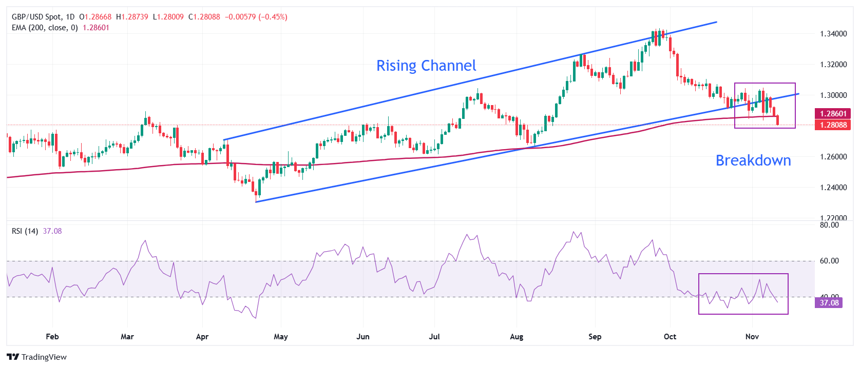 英镑兑美元汇率创下近三个月新低,接近1.2800。英镑/美元在未能守住200天指数移动平均线(EMA)后继续下跌,EMA的交易价格约为1.2860。在从上升通道的下限突破后,Cable的整体趋势转为负值,这引发了看跌反转。