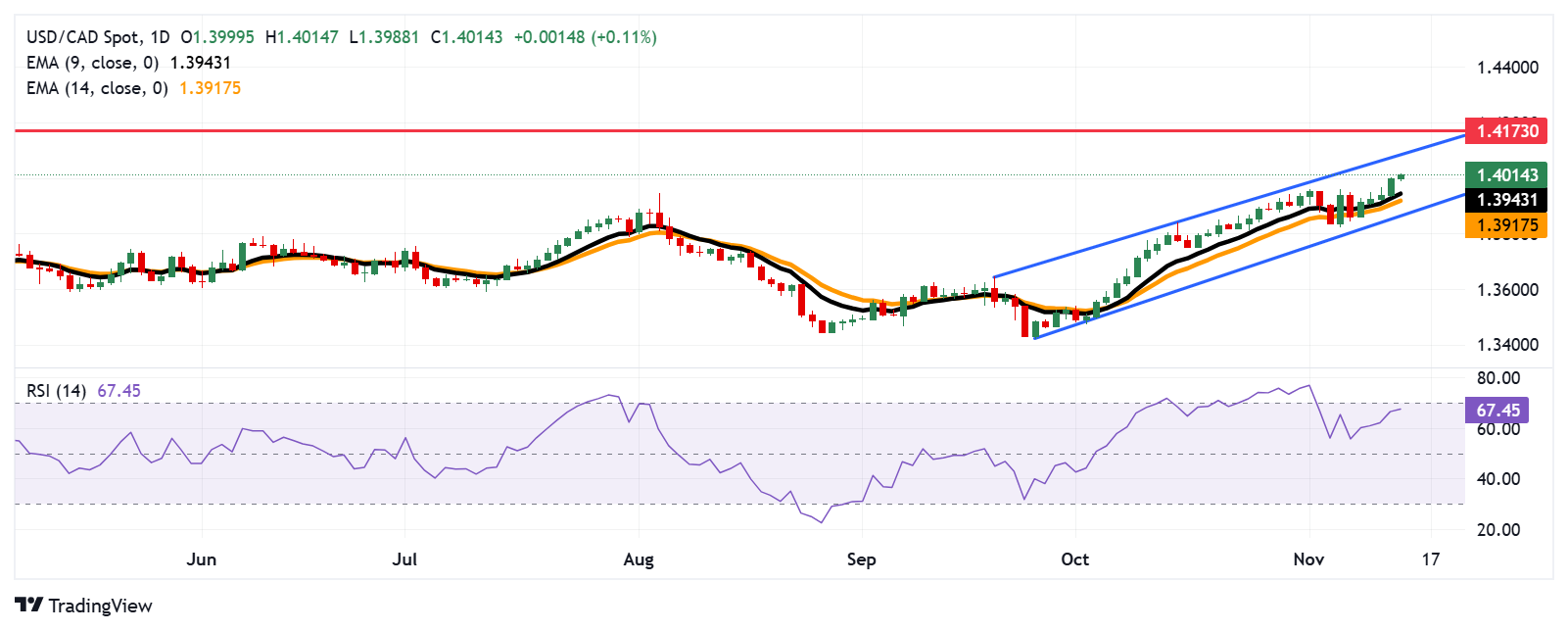 美元/加元连续第五天上涨,周四亚洲时段交投于 1.4010 附近。在日线图上,分析表明该货币对在上升通道模式内向上移动,表明持续的看涨偏见。
