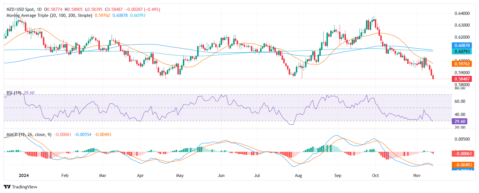 技术指标强化了新西兰元/美元对的看跌情绪。相对强弱指数(RSI)已跌破30,表明超卖区域和抛售压力上升。RSI的下降斜率表明这种压力正在加剧。此外,移动平均线收敛发散(MACD)仍然看跌,直方图呈下降和红色。这些指标与价格走势一致,证实了该货币对的下行轨迹。
