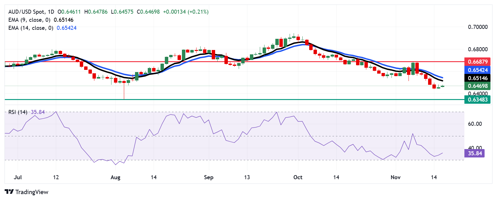 周一,澳元/美元徘徊在0.6470左右,反映出日线图上的短期下行压力,因为该货币对一直低于九天指数移动平均线(EMA)。然而,14天相对强弱指数(RSI)已从30点开始攀升,表明抛售压力可能正在减弱,并暗示有可能向上调整。