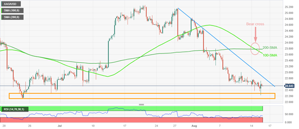 白银价格(XAG/USD)尽管在周三亚洲早盘期间一度升至 22.50 美元,但仍面临七周来最低水平的压力。在此过程中,在市场普遍的避险情绪以及美元和美联储货币政策会议纪要走强的情况下,明亮的金属减弱了前一天从关键支撑区域的修正性反弹。