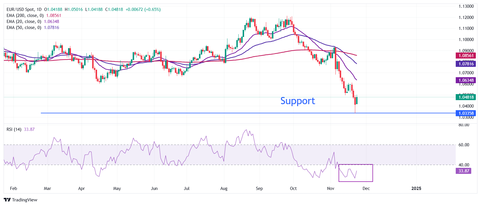 随着美元(USD)暴跌,周一北美时段欧元/美元在1.0500的心理阻力附近反弹。衡量美元对六种主要货币价值的美元指数(DXY)在当选总统唐纳德·特朗普选择基金经理斯科特·贝森特担任财政部长后跌至107.00左右。
