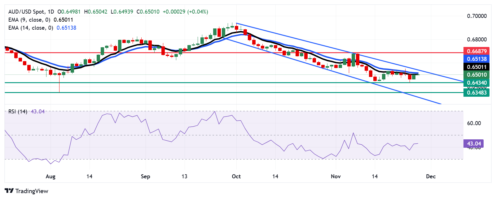 周四,澳元/美元在0.6500附近交易,技术分析表明短期看跌势头日益增强。该货币对仍处于下行通道内,而14天相对强弱指数(RSI)仍低于50,反映出持续的负面情绪。
