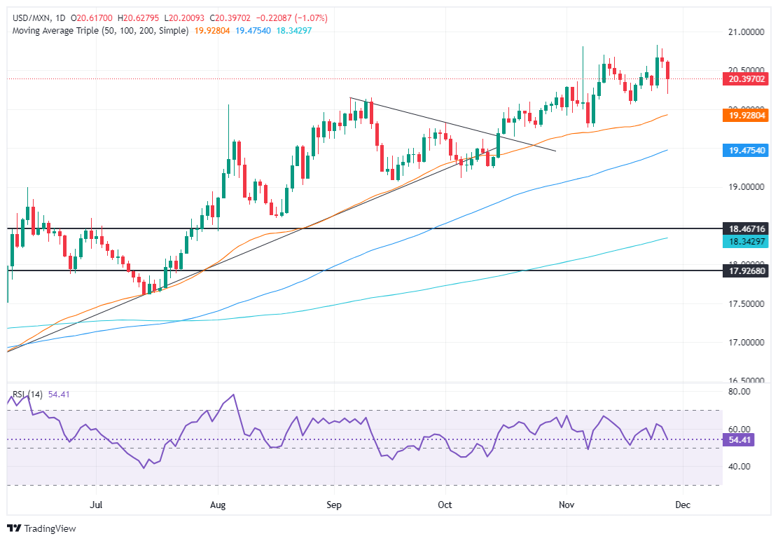 随后,美元/墨西哥比索在周一触及年初至今的高点20.82后开始下跌。